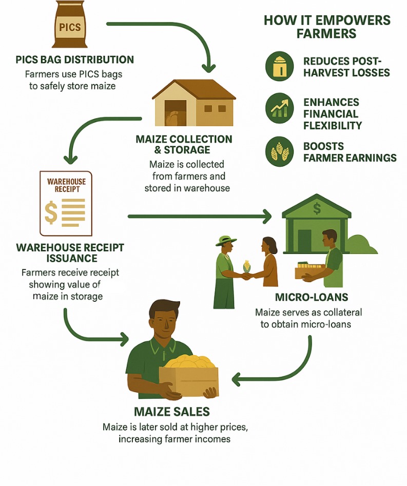 With PICS bags, farmers can safely store large volumes of maize, reducing post-harvest losses and improving food security. Farmers then bring sale-intended maize to our warehouse. Once received, we issue warehouse receipts that reflect the quantity and estimated value.